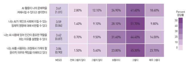 조사 결과, ‘AI 활용이 문해력을 저해할 수 있다’와 ‘AI가 미칠 잠재적 영향에 대해 비판할 수 있다’에 대해 응답자의 60% 이상이 긍정, ‘AI 사용 과정에서의 윤리적 책임을 이해한다’는 69%가 긍정으로 가장 높은 수치를 보였다.