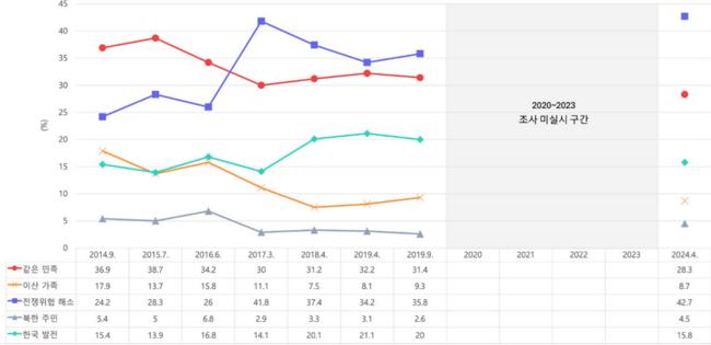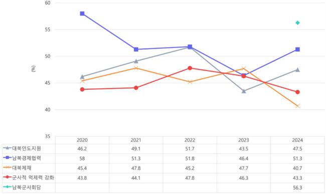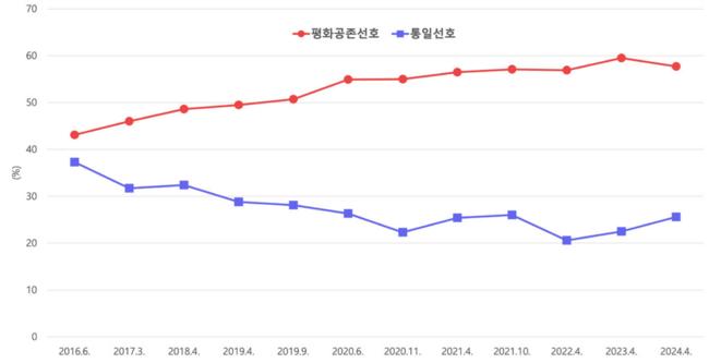 국립외교원 외교안보연구소의 '2015~2024 한국인의 대북·통일 인식 분석'에 따르면 통일에 대한 지지는 낮아진 반면 평화공존에 대한 지지는 높아지고, 안보 불안 해소에 대한 요구가 강한 것으로 조사됐다.