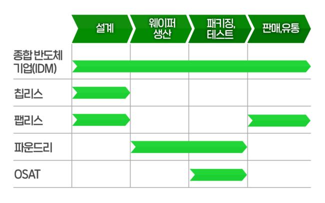 하지만 반도체 구조가 복잡한 비메모리 반도체에 대해서는 설계, 생산, 패키징, 테스트를 전문으로 하는 팹리스, 파운드리, OSAT 같은 기업들과 역할을 나누어 수행한다.