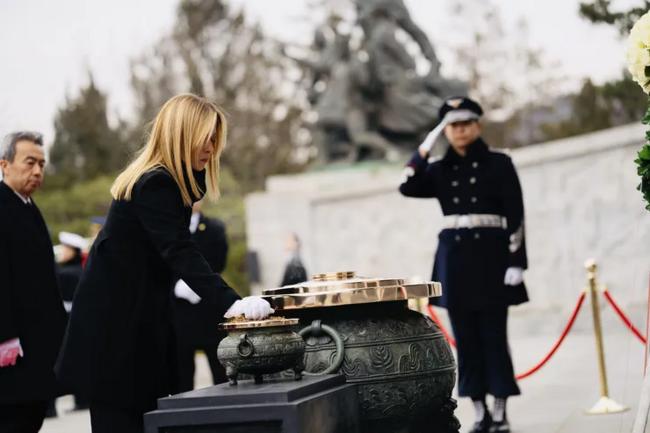 26.1.18일, 멜로니 총리 현충원 참배 (이미지=KTV) "오늘 저는 조국의 이름으로 가장 소중한 생명을 바치신 모든 분들 앞에 고개 숙여 경의를 표합니다.