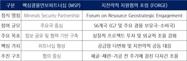 기존의 핵심광물안보파트너십(MSP)이 정보 공유 중심의 느슨한 협력체였다면, 26.2월 출범한 '지전략적 자원협력 포럼(FORGE: Forum on Resource Geostrategic Engagement)'은 강력한 정치적 실행력을 갖춘 플랫폼이다.
