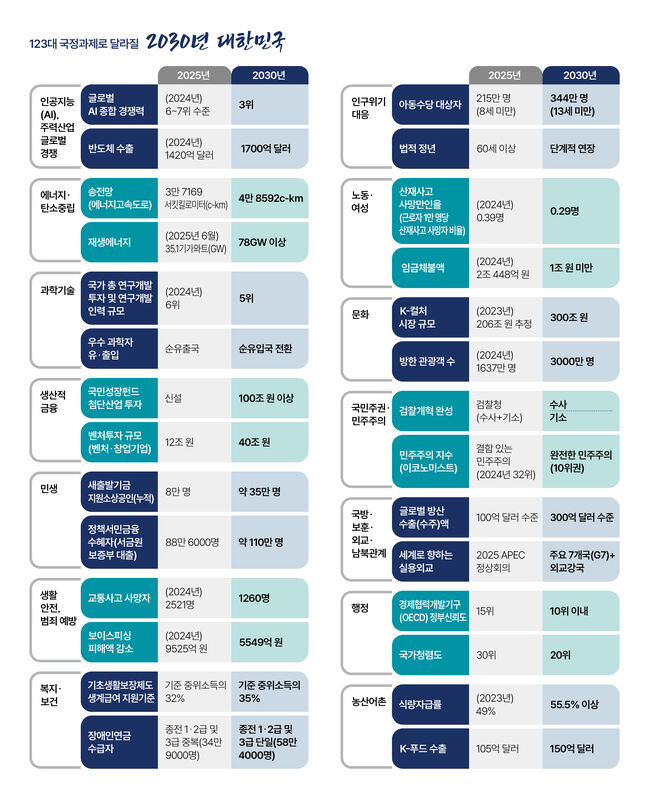 국민주권정부 ‘국정운영 5개년 계획' 추진의 성공으로 2030년 달라질 국민의 삶도 제시됐다. 정부의 과감한 지원으로 AI 종합 경쟁력은 세계 3위 수준으로 올라설 것이다. 30% 이상 증가한 재생에너지와 에너지고속도로가 경제 성장의 단단한 기반이 된다. 100조 원 이상의 국민성장펀드가 첨단산업을 뒷받침하는 가운데 새출발기금으로 소상공인 35만 명, 정책서민금융으로 110만 명이 혜택을 본다. 교통사고 사망자와 보이스피싱 피해액을 절반 이상 줄이고 간병비 부담도 확 줄어든다. 산재 후진국, 임금체불국 같은 오명도 벗어나며 노동시간이 연간 1,700시간대로 줄어든다. K-컬처 300조 원 시대를 열고 한국을 찾는 관광객이 3,000만 명에 이르게 된다.