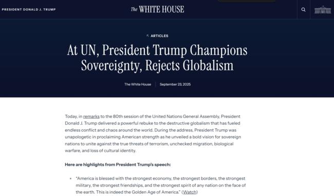 Today, in remarks to the 80th session of the United Nations General Assembly, President Donald J. Trump delivered a powerful rebuke to the destructive globalism that has fueled endless conflict and chaos around the world. During the address, President Trump was unapologetic in proclaiming American strength as he unveiled a bold vision for sovereign nations to unite against the true threats of terrorism, unchecked migration, biological warfare, and loss of cultural identity.